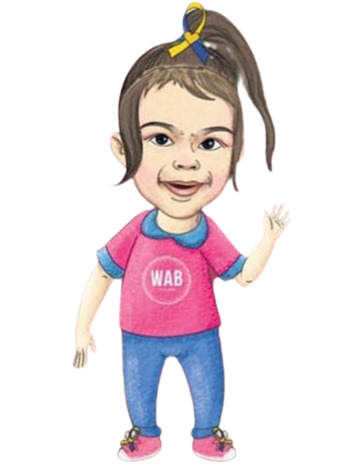 MouMou wears WAB t-shirts, and always wears a blue & yellow Down syndrome logo hair clip, and blue and yellow shoelaces to represent the colours of Down syndrome, and to celebrate who she is. MouMou’s best friends are Enzo and Harvey who live with her, and her mummy and daddy.